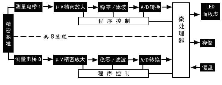 智能應(yīng)變測量儀由應(yīng)變電橋、放大器、信號(hào)調(diào)理電路、微處理器、顯示記錄器等基本部分組成。