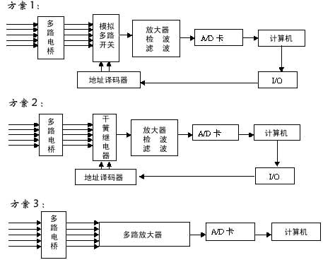 從三種方案的結(jié)構(gòu)框圖我們很明顯的看出他們的區(qū)別。分析方案(1):它的主要優(yōu)點(diǎn)是多路信號(hào)共用一路放大模塊成本低,但它的不足之處在于它需要反向控制,也就是它需要一塊I/O卡,尤其關(guān)鍵的一點(diǎn)是在這個(gè)系統(tǒng)中從電橋輸出的信號(hào)特別微弱,而模擬開關(guān)切換的信號(hào)很容易將該微弱信號(hào)淹沒。