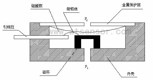通過硅平面集成工藝技術(shù)在硅片上制作四個(gè)擴(kuò)散電阻作為應(yīng)力敏感元件,用機(jī)械研磨加各向同性化學(xué)腐蝕方法將硅襯底加工成周邊固支的平膜片彈性力學(xué)結(jié)構(gòu)。四個(gè)力敏電阻,連成惠斯頓全橋應(yīng)變電路,這種電路具有最高的靈敏度、最好的溫度補(bǔ)償性能和最高的輸出線性度。硅杯受到一個(gè)差值壓力,力敏電阻的電阻率改變,引起電阻阻值改變。電阻率的改變是由于硅膜片的形變引起的,測(cè)試端P1與引壓端P2的壓力差與硅膜片的形變成正比,也就是電橋的輸出與壓力差成正比。