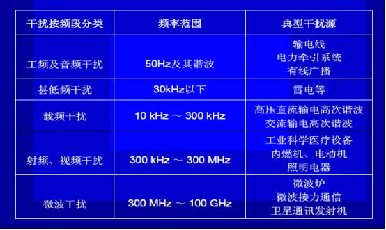 電磁干擾的產(chǎn)生包括發(fā)射源產(chǎn)生干擾噪聲的原因和接收源感受干擾噪聲的原因,發(fā)射源產(chǎn)生干擾噪聲的原因有:發(fā)射源的隱性頻率;發(fā)射源對接收源所產(chǎn)生的混附波與調(diào)幅干擾;發(fā)射源的不當調(diào)幅調(diào)變輸出;接收機本地振蕩噪聲;時鐘信號傳送的衍生噪聲;電機裝置如馬達繼電器;電力系統(tǒng)如火花電暈噪聲;閃電雷擊。接收源感受干擾噪聲的原因有:接收源射頻頻率選用不當造成噪聲滲入干擾;混附波與調(diào)幅干擾;電源線噪聲耦合至接收源造成干擾;電子盒箱柜隔離不佳滲入接收源造成干擾。電磁干擾的頻段劃分如下圖: